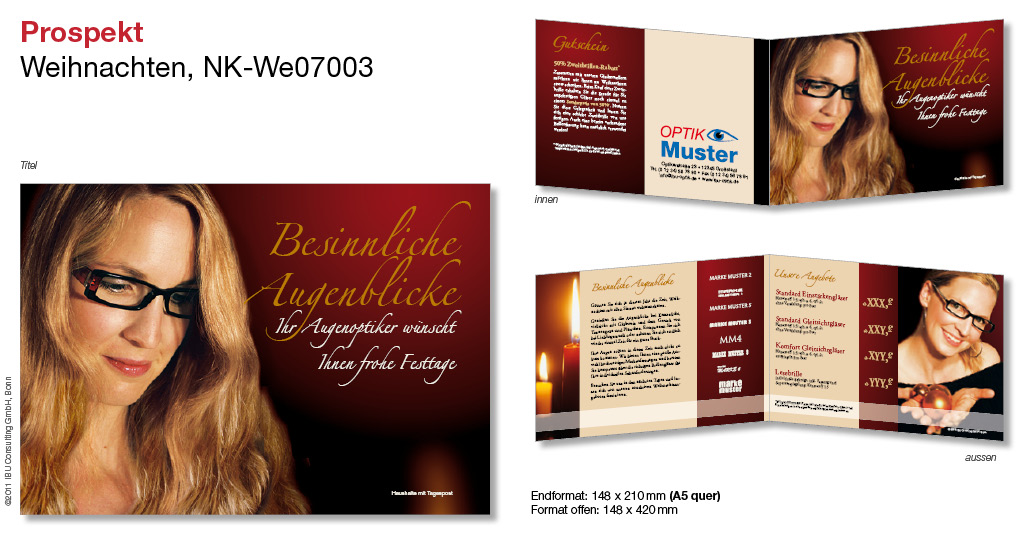 Mit seinen warmen Farbtönen und den weihnachtlichen Motiven strahlt dieser vierseitige Prospekt im Querformat Gemütlichkeit und Besinnlichkeit aus und erwärmt jedes Kundenherz!