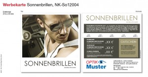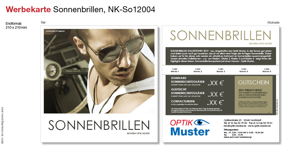 Zeigen Sie mit dieser Werbekarte, was Sie zu bieten haben und kombinieren Sie die Labels der angesagtesten Marken mit einer Information über die Auswahl an Sonnenschutzgläsern in Ihrem Geschäft. Ein aufgedruckter Gutschein macht den Besuch Ihrer Filiale doppelt attraktiv!
