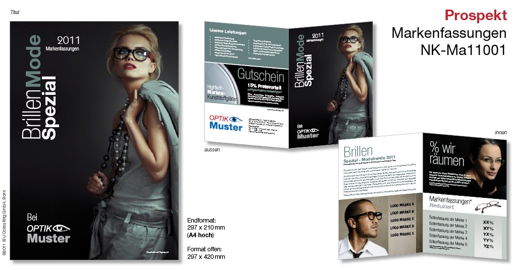 Höchste Zeit, dem Thema „Brillenmode“ eine Spezialausgabe Ihrer Werbung zu widmen! Dieser vierseitige Prospekt vereint Informationen zu den Modetrends der kommenden Saison mit den Leistungen und Angeboten Ihres Geschäfts und einem exklusiven Rabatt-Gutschein.