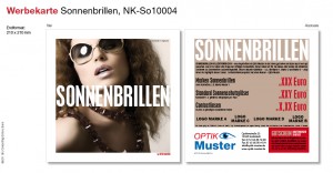 Zeigen Sie mit dieser Werbekarte, was Sie zu bieten haben und kombinieren Sie die Labels der angesagtesten Marken mit einer Information über die Auswahl an Sonnenschutzgläsern in Ihrem Geschäft. Ein aufgedruckter Gutschein macht den Besuch Ihrer Filiale doppelt attraktiv!