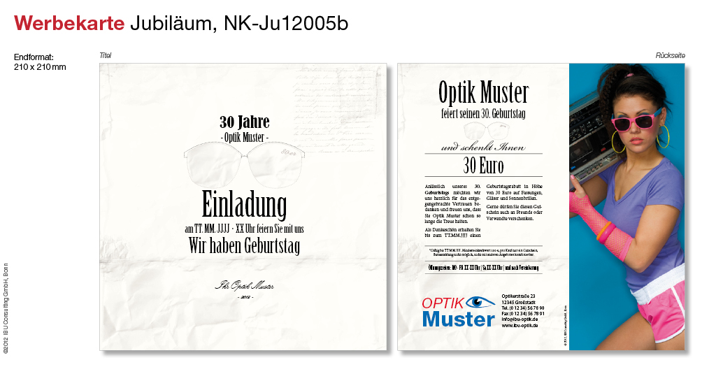 Seit der Gründung Ihres Geschäftes sind inzwischen 30 Jahre vergangen und Ihre Kunden wissen, dass Sie weit mehr zu bieten haben als Plastikbrillen in Pink und Neongrün. Die attraktiven Geburtstagsrabatte zum Geschäftsjubiläum können trotzdem nicht schaden!